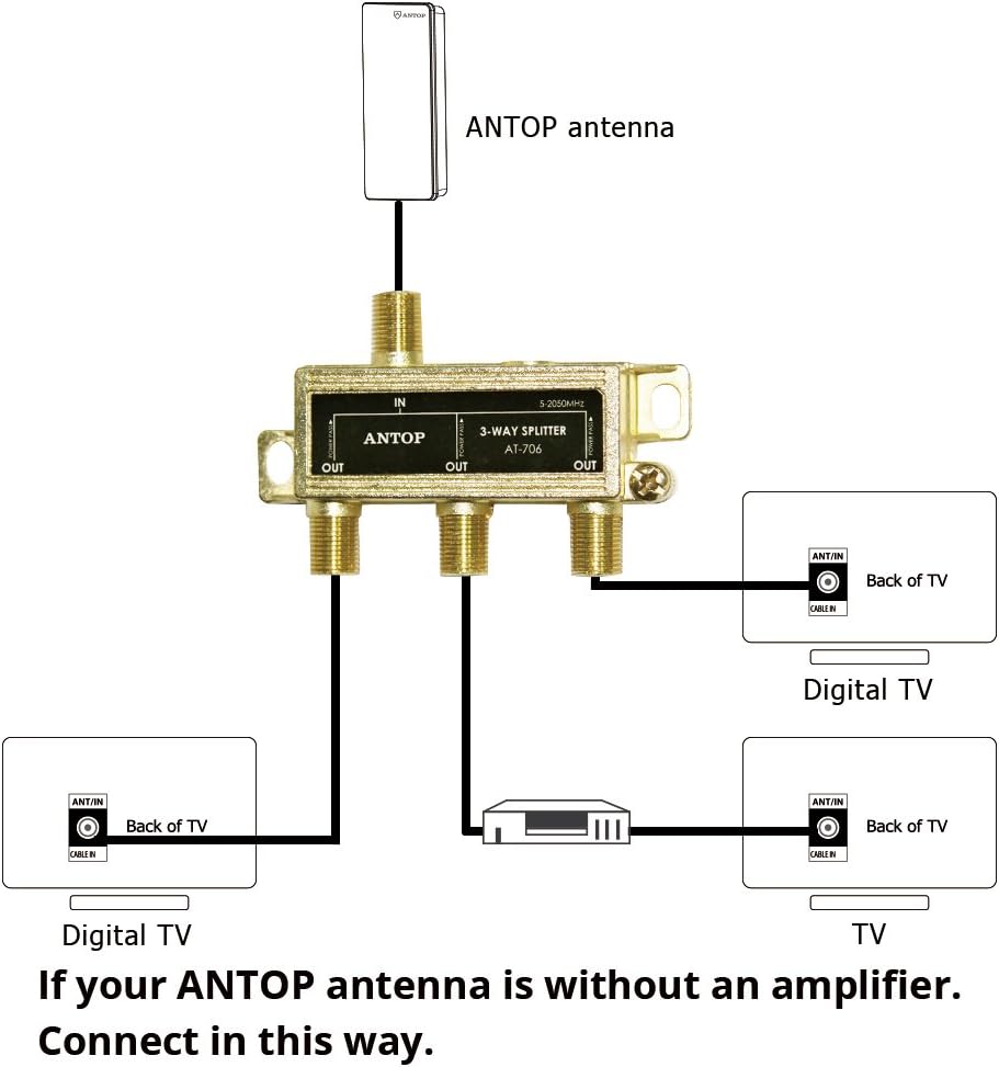 Amazon.com: ANTOP Low-Loss 3 Way Coaxial Splitter for TV Antenna and Satellite 18K Gold-Plated Chassis 2GHz - 5-2050MHz All Port DC Power Passing: Electronics